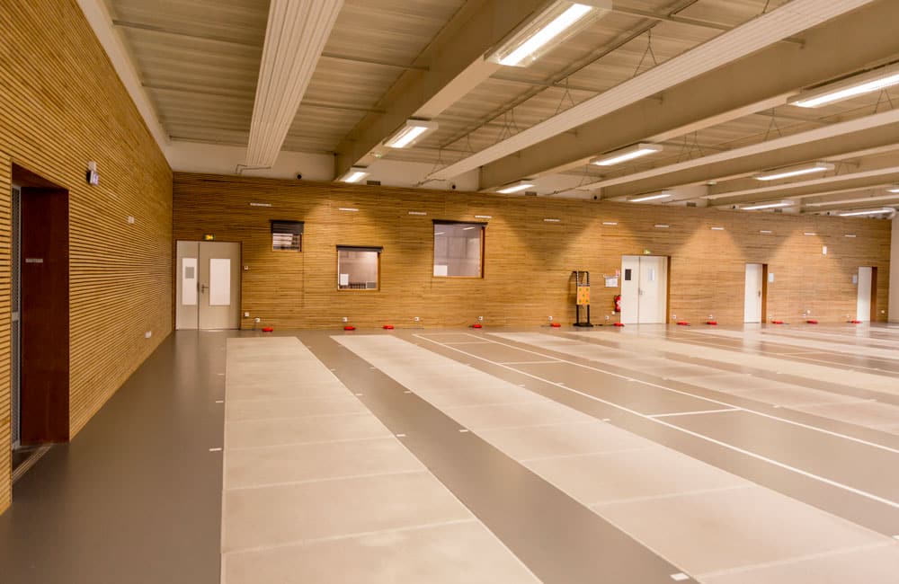 OGALOD a réalisé, pour le gymnase Albert-Smirlian, un travail technique de menuiserie très spécifique : création d’un habillage des murs en tasseaux de bois de châtaignier pour offrir le meilleur confort visuel et acoustique aux spectateurs et sportifs.